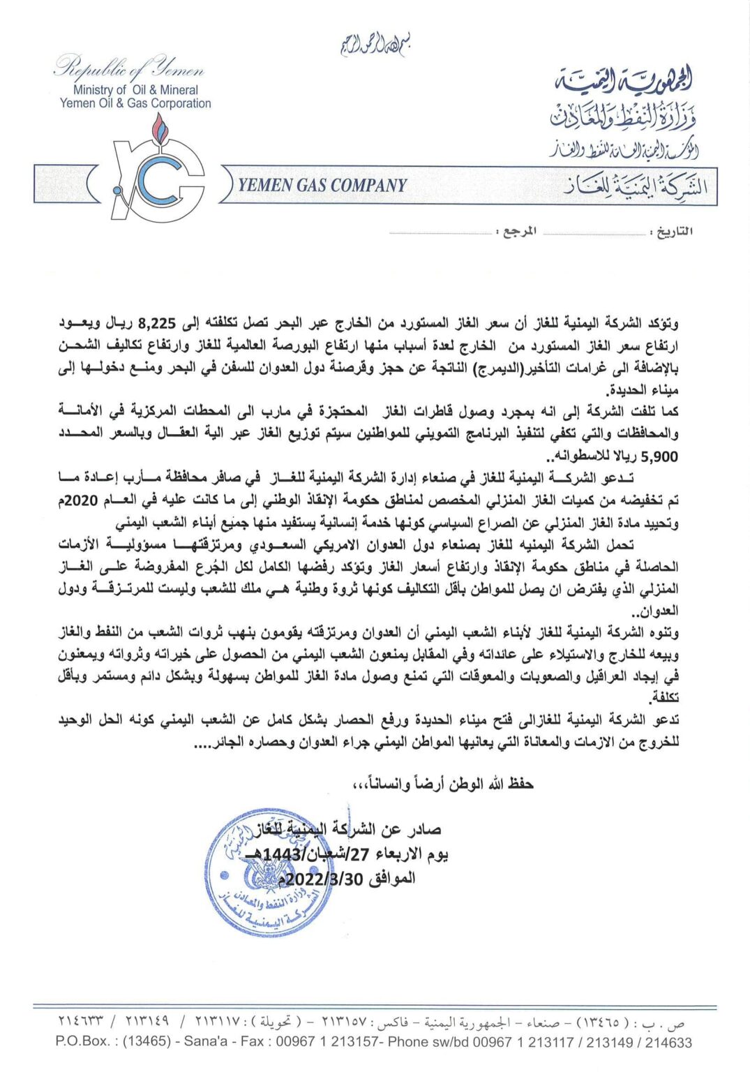 وحمل بيان شركة الغاز دول التحالف والحكومة الشرعية مسؤولية الأزمة القائمة في مادة الغاز المنزلي، مؤكدا على رفض شركة الغاز بصنعاء لكل الجرع السعرية المفروضة من سلطة الشرعية.